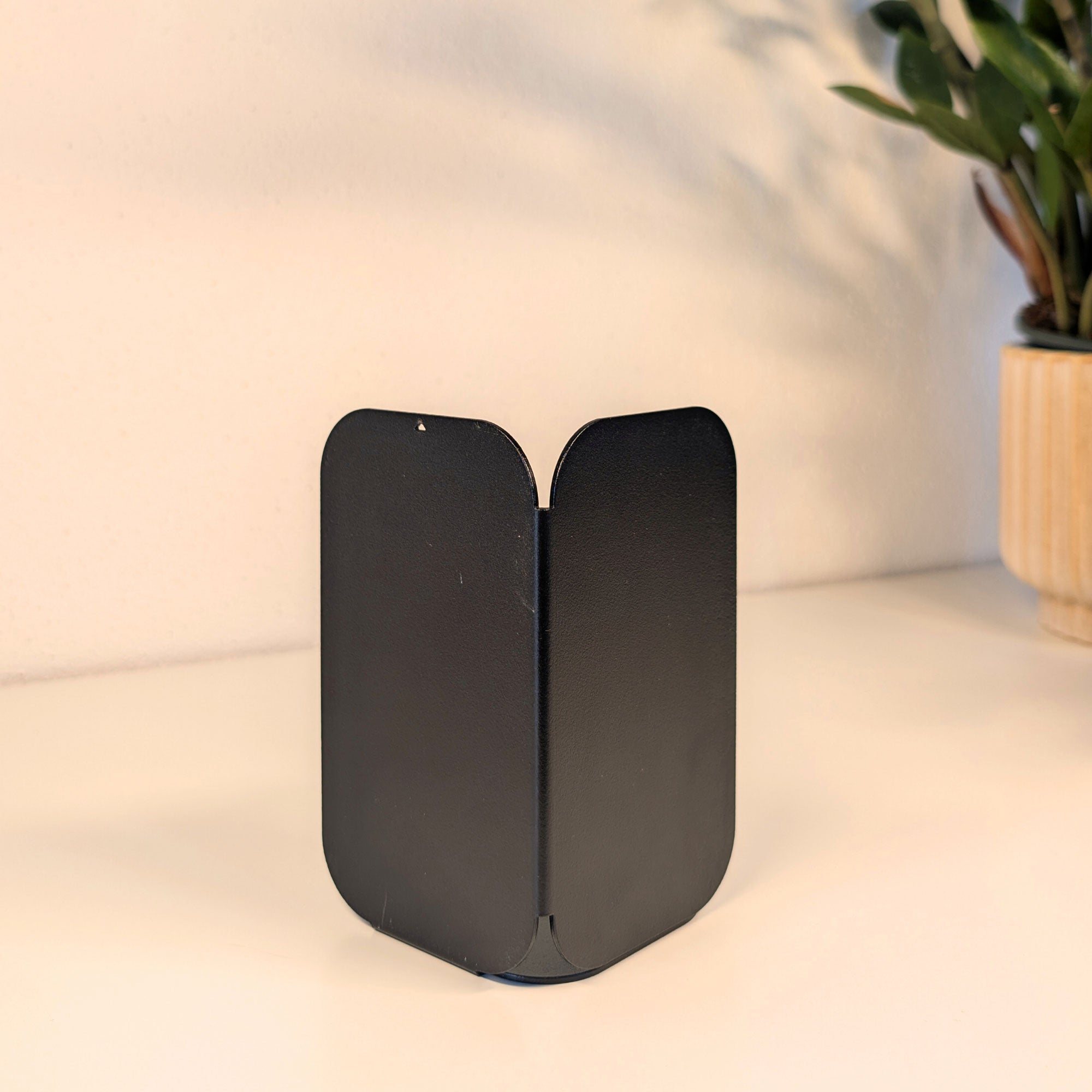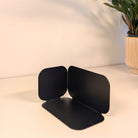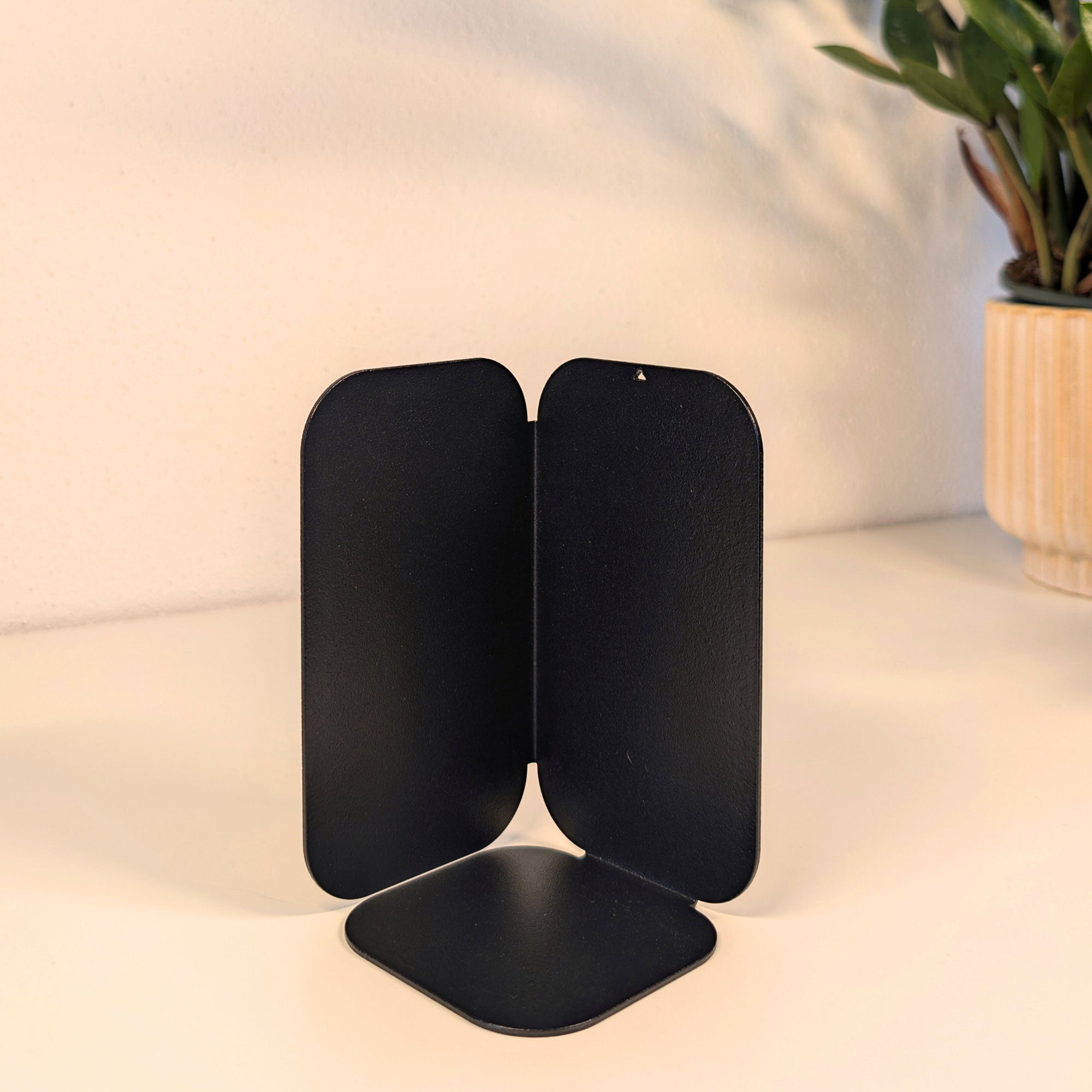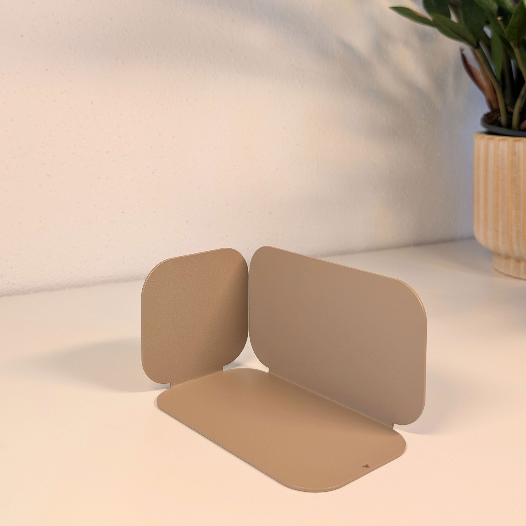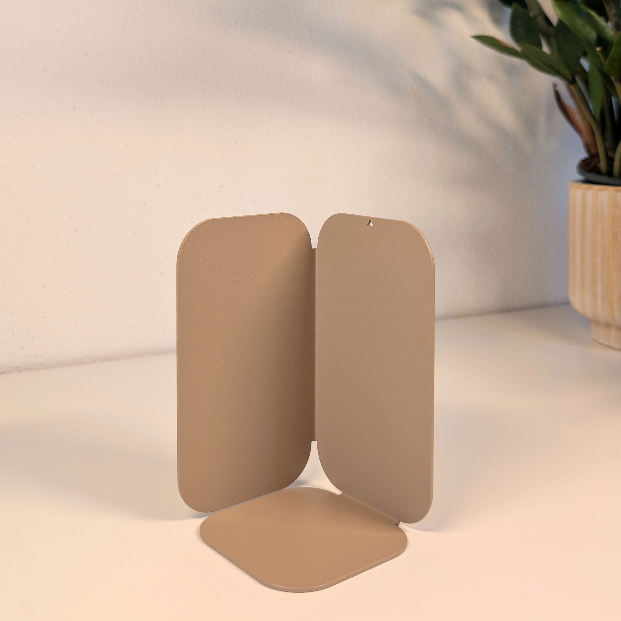 Minimalistisch, wandelbar, funktional: Diese pulverbeschichtete Metall-Buchstütze überzeugt durch ihre dreiseitige Form mit sanften Rundungen. Je nach Drehung entsteht eine neue Geometrie – schmal, breit oder geschlossen. Gefertigt aus 1 mm Stahl (14 × 8 × 8 cm), bietet sie stabilen Halt für Bücher und setzt zugleich ein stilvolles Statement im Regal oder auf dem Tisch.