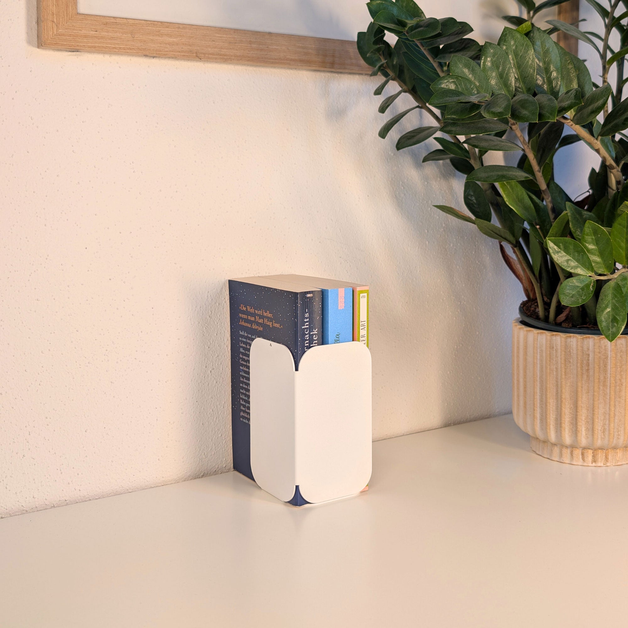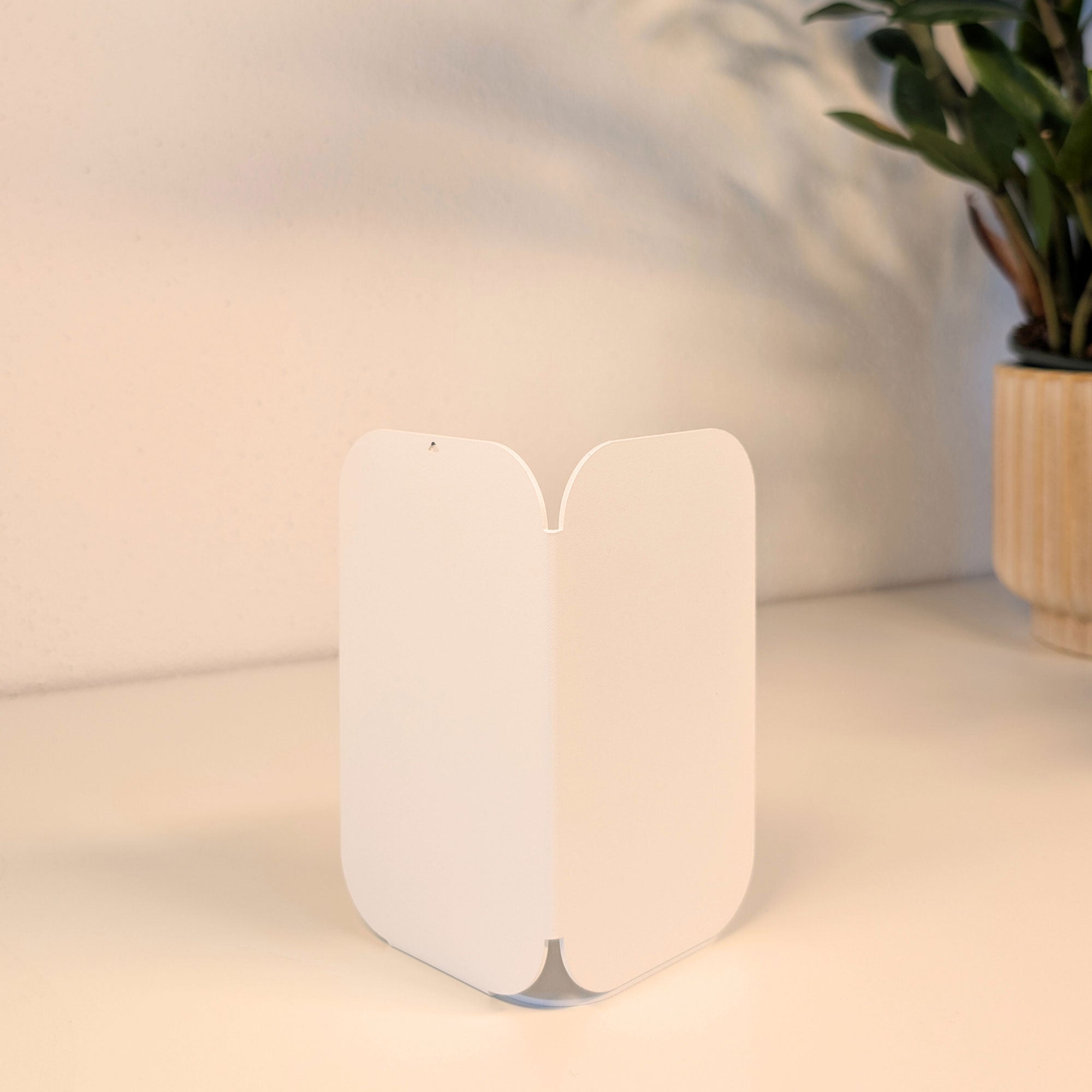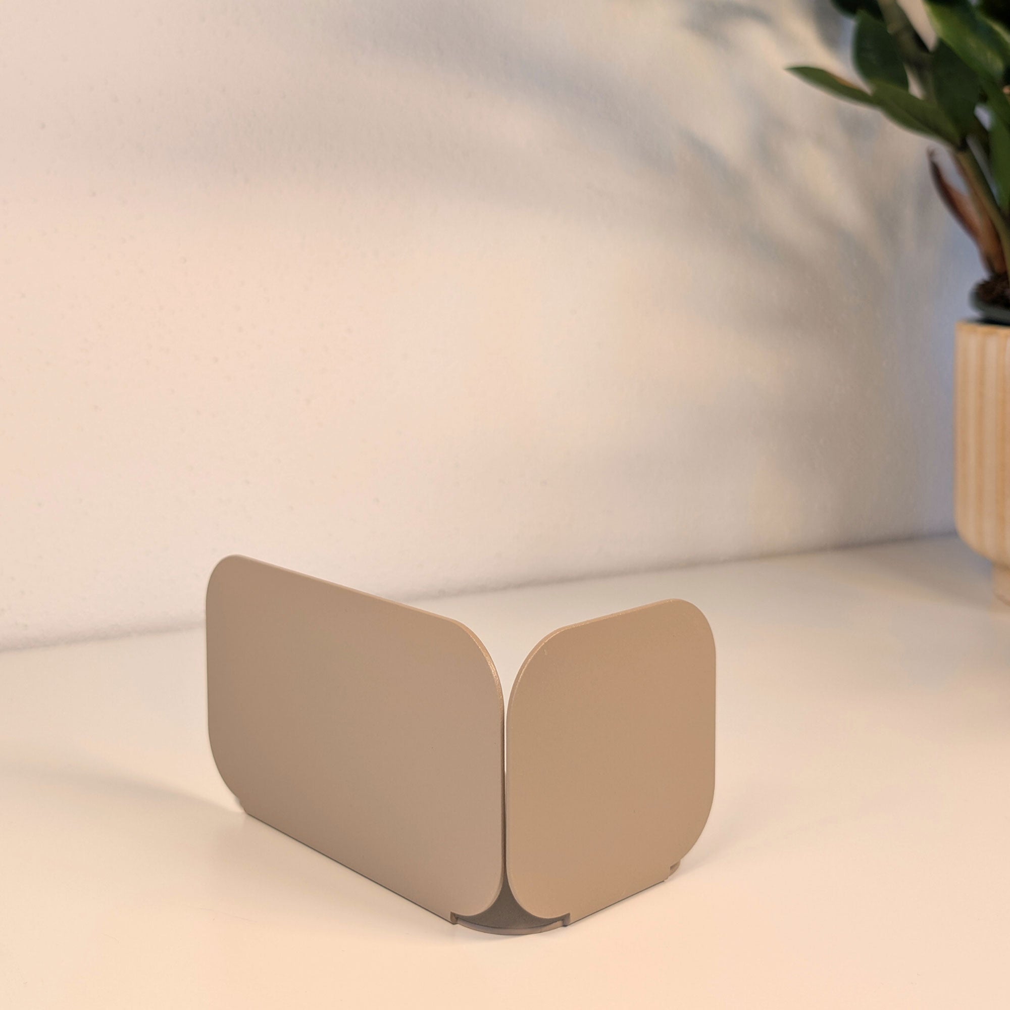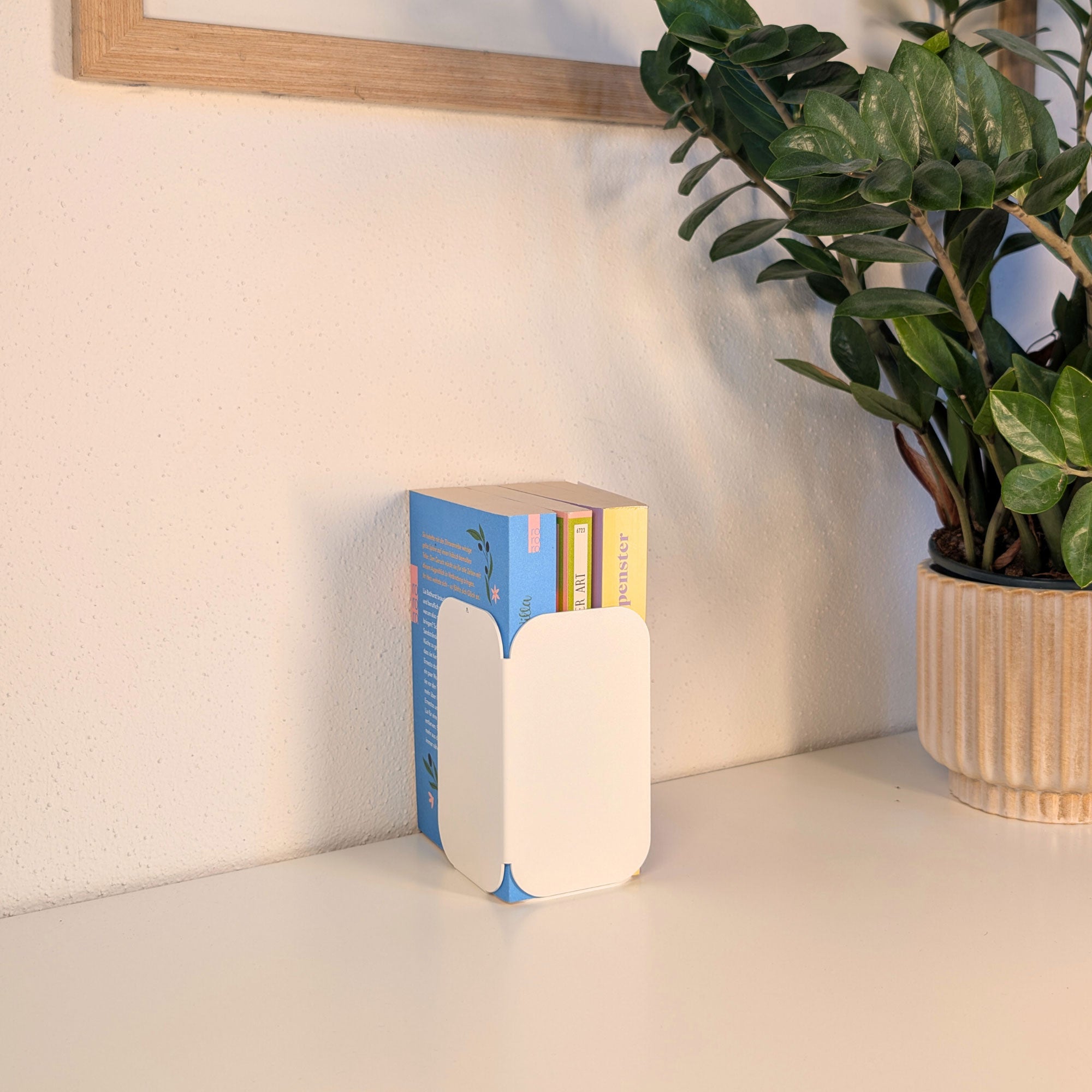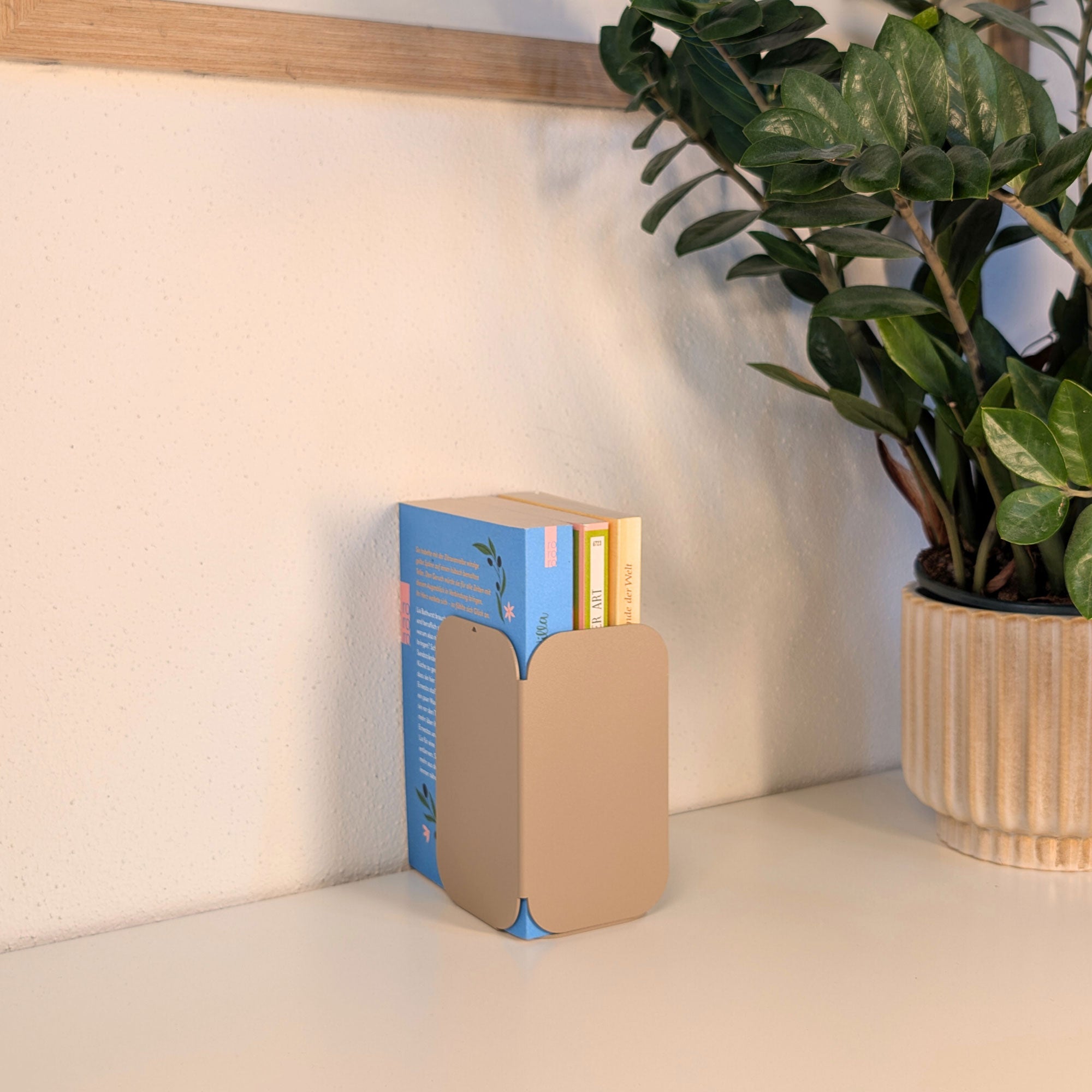 Minimalistisch, wandelbar, funktional: Diese pulverbeschichtete Metall-Buchstütze überzeugt durch ihre dreiseitige Form mit sanften Rundungen. Je nach Drehung entsteht eine neue Geometrie – schmal, breit oder geschlossen. Gefertigt aus 1 mm Stahl (14 × 8 × 8 cm), bietet sie stabilen Halt für Bücher und setzt zugleich ein stilvolles Statement im Regal oder auf dem Tisch.