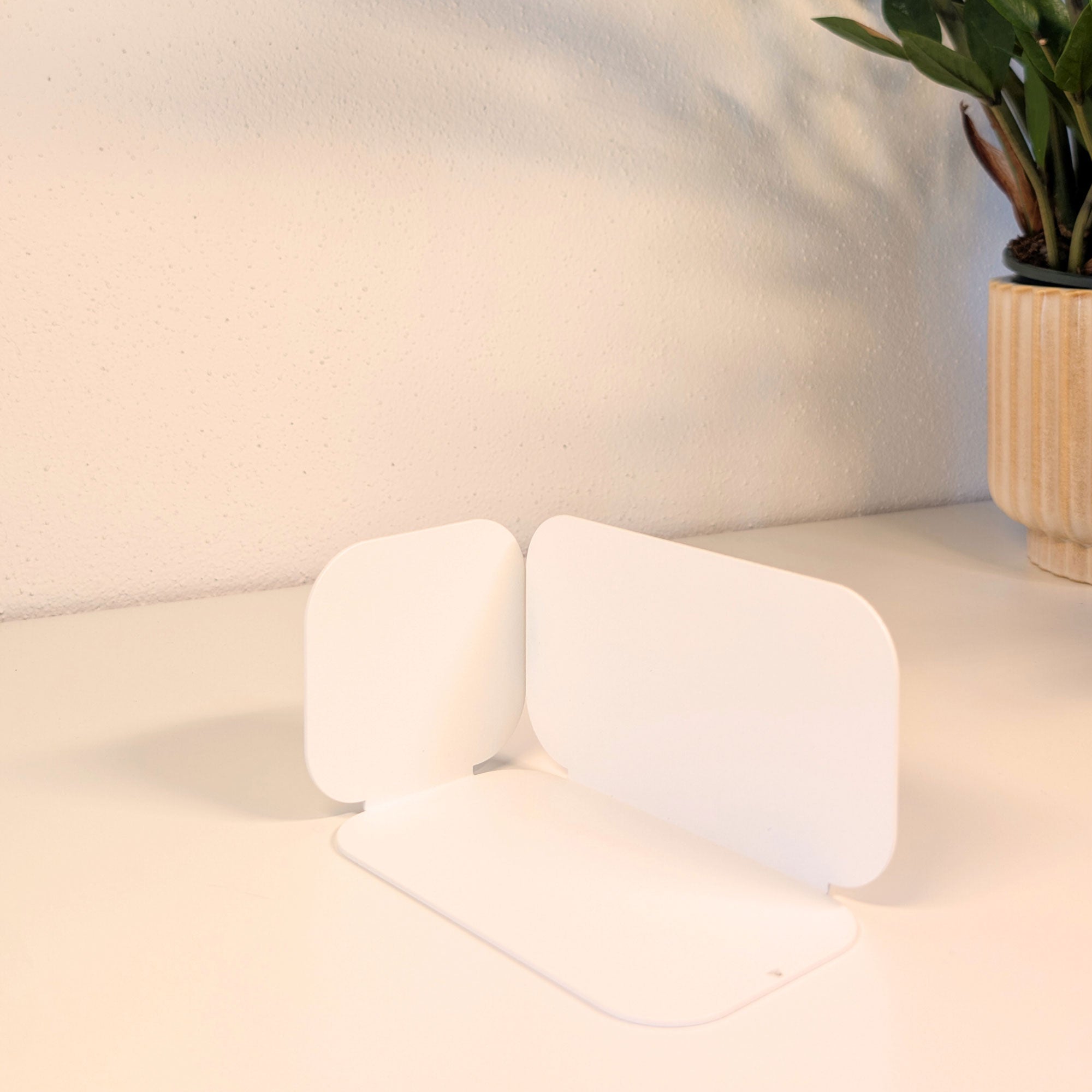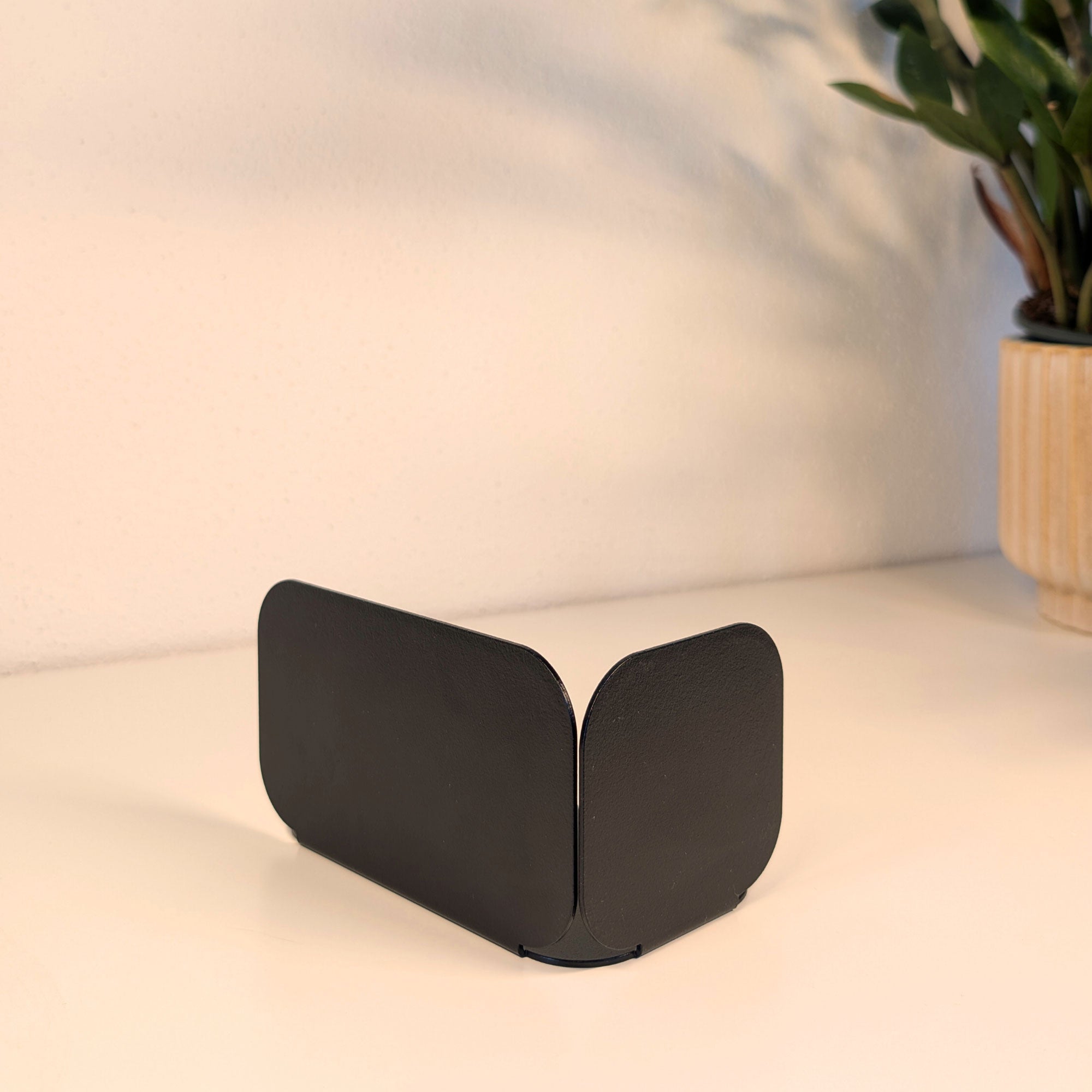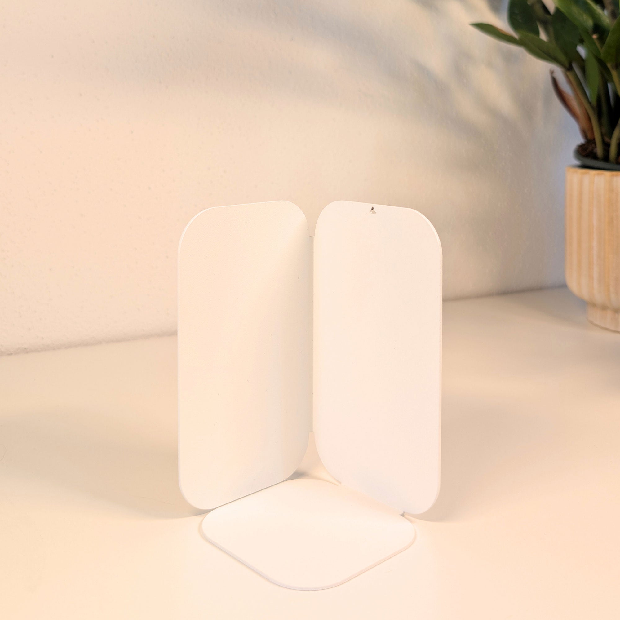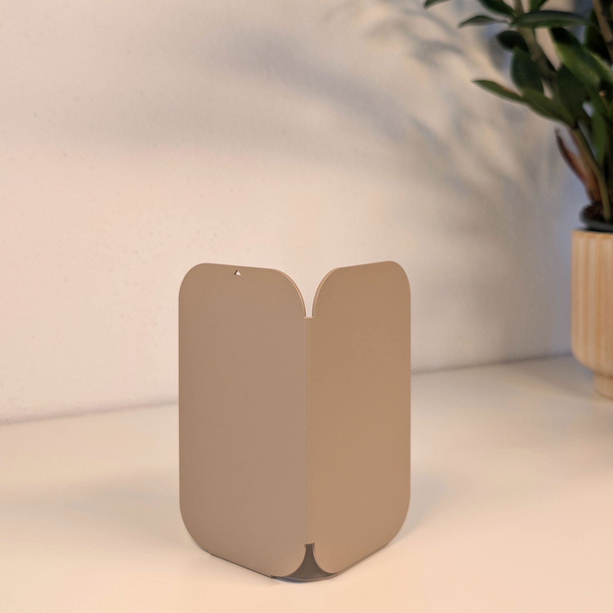 Minimalistisch, wandelbar, funktional: Diese pulverbeschichtete Metall-Buchstütze überzeugt durch ihre dreiseitige Form mit sanften Rundungen. Je nach Drehung entsteht eine neue Geometrie – schmal, breit oder geschlossen. Gefertigt aus 1 mm Stahl (14 × 8 × 8 cm), bietet sie stabilen Halt für Bücher und setzt zugleich ein stilvolles Statement im Regal oder auf dem Tisch.
